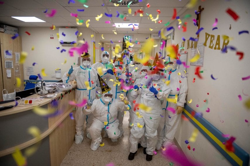 Il personale del reparto di terapia intensiva dell'ospedale San Filippo Neri saluta l'arrivo del 2021.