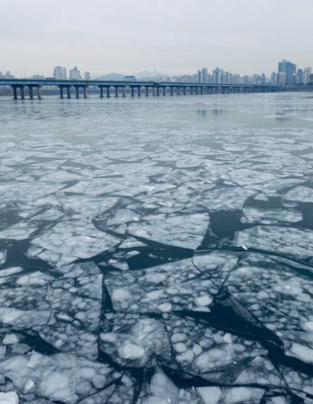 Il grande fiume Han che attraversa la capitale dalla Corea del Sud, completamente ghiacciato per l'ondata di gelo che sta attraversando l'estremo oriente asiatico. Dalle immagini si vede il corso d'acqua non più navigabile e per questo sta provocando disagi alle imprese ittiche coreane.