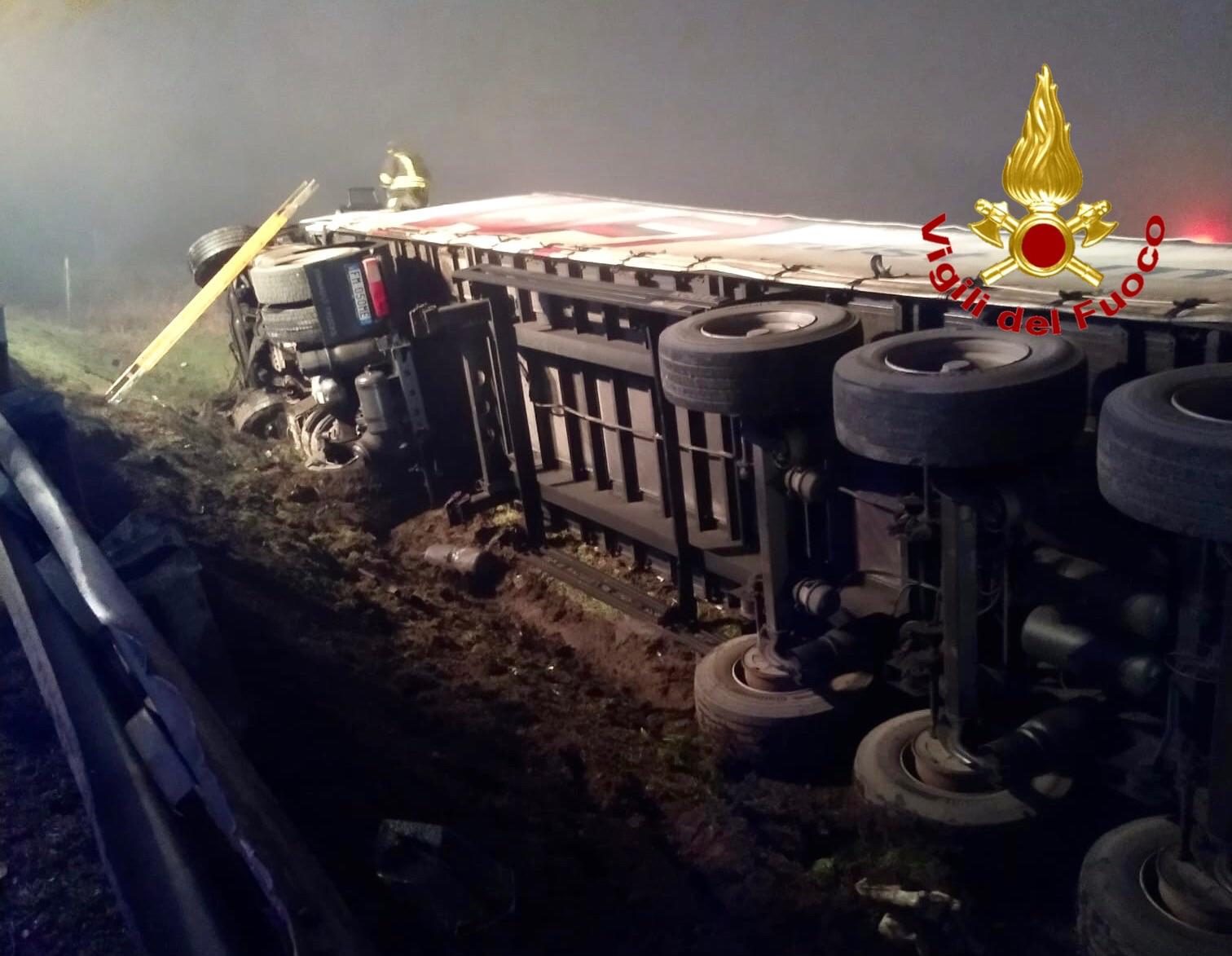 Incidente all'alba in autostrada: camion sfonda guardrail e si ribalta, conducente resta incastrato