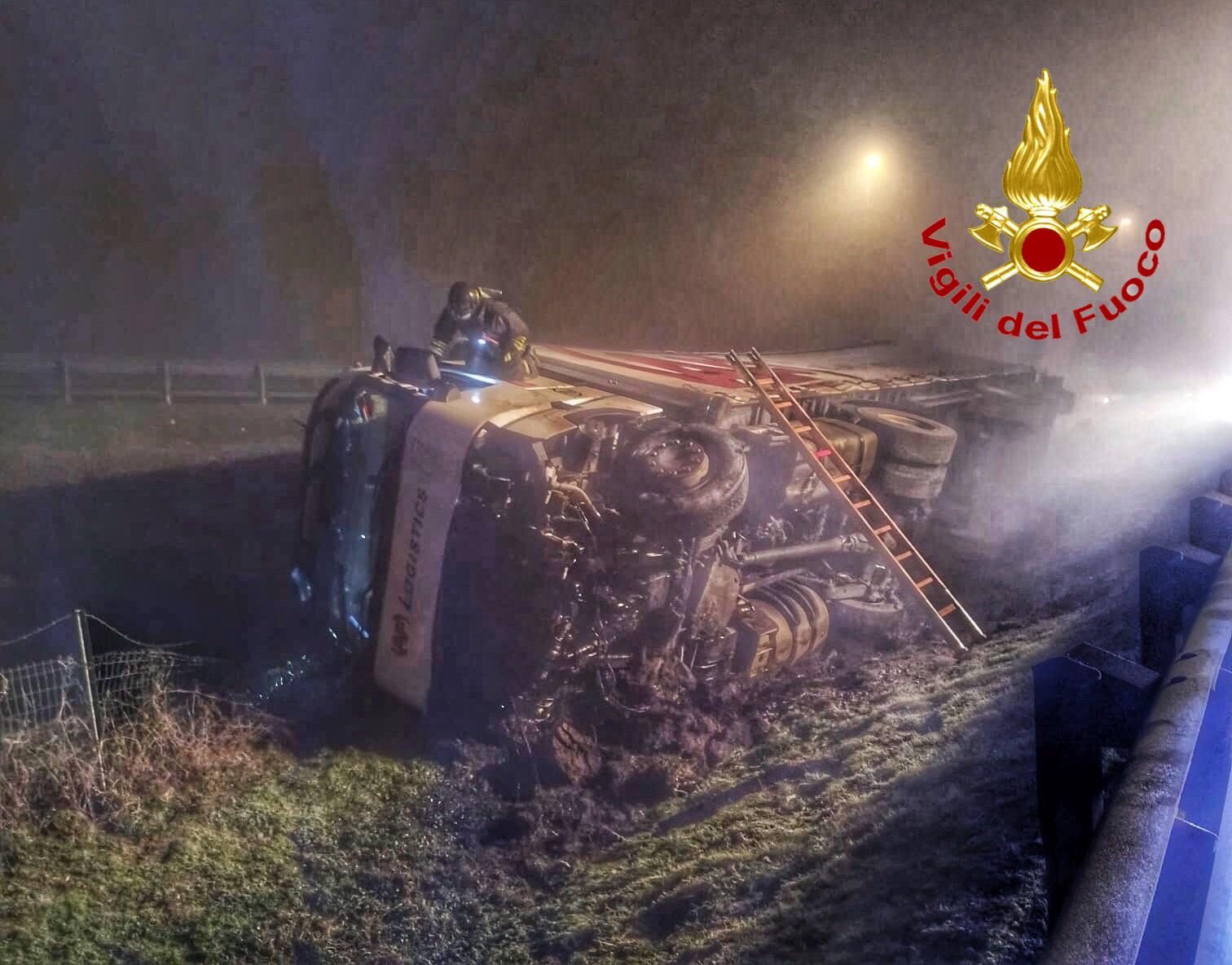 Incidente all'alba sull'Autostrada A1 a Melegnano, vicino Milano. Un tir ha sfondato il guardrail ribaltandosi su un fianco. Il conducente, un uomo di 39 anni, è rimasto incastrato nella cabina: è stato estratto dai vigili del fuoco, ma fortunatamente non ha riportato alcuna grave ferita e ha rifiutato il trasporto in ospedale.