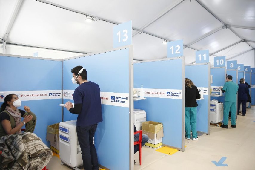Inizio della campagna vaccinale anti covid per il personale scolastico docente e non docente. Nelle immagini il polo vaccinale allestito a Fiumicino aeroporto dove oltre agli insegnanti si contentano le vaccinazioni delle altre categorie