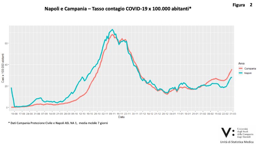 Sono 1.894 i nuovi casi di Coronavirus a Napoli città nell’ultima settimana di febbraio (dal 22 al 28), con un aumento del 49% rispetto alla settimana precedente, quando i positivi erano 1.275. Un vero e proprio boom che ha colpito soprattutto le fasce più giovani, con contagi quasi raddoppiati, in particolare nella fascia tra 19 e 45 anni.