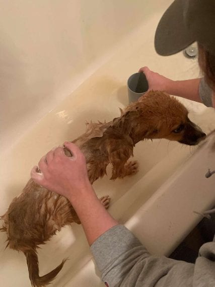 Questo cucciolo è stato trovato legato all'esterno di questa abitazione: "Era gravemente sottopeso e ricoperto di escrementi e immondizia" le parole dell'uomo che l'ha ritrovato e deciso di soccorrerlo. Il cane era stato chiaramente trascurato dai suoi ex padroni, che si erano trasferiti dall'edificio dopo essere rimasti indietro con l'affitto. Avevano lasciato il cucciolo  legato a un palo: un collare da gatto intorno al collo, senza cibo né acqua. L'uomo non era sicuro di come avrebbe reagito il cucciolo al contatto umano, ma una volta che gli ha mostrato un po 'di gentilezza, il cane si è mostrato affabile. "All'inizio si è rannicchiato perché aveva tanta paura delle persone, ma una volta che ho iniziato ad accarezzarlo è diventato dolce" - racconta. Ha portato a casa il cucciolo e l'ha immediatamente messo nella vasca da bagno. Mentre lo sciacquava, l'acqua divenne marrone e il cane assetato cercava di leccarla. Bonnie Blue, così come è stato chiamato dal suo nuovo padrone, dopo qualche settimana è diventato più sicuro di sé e ha stretto amicizia con l'altro cane di casa con cui adesso condivide tutto.