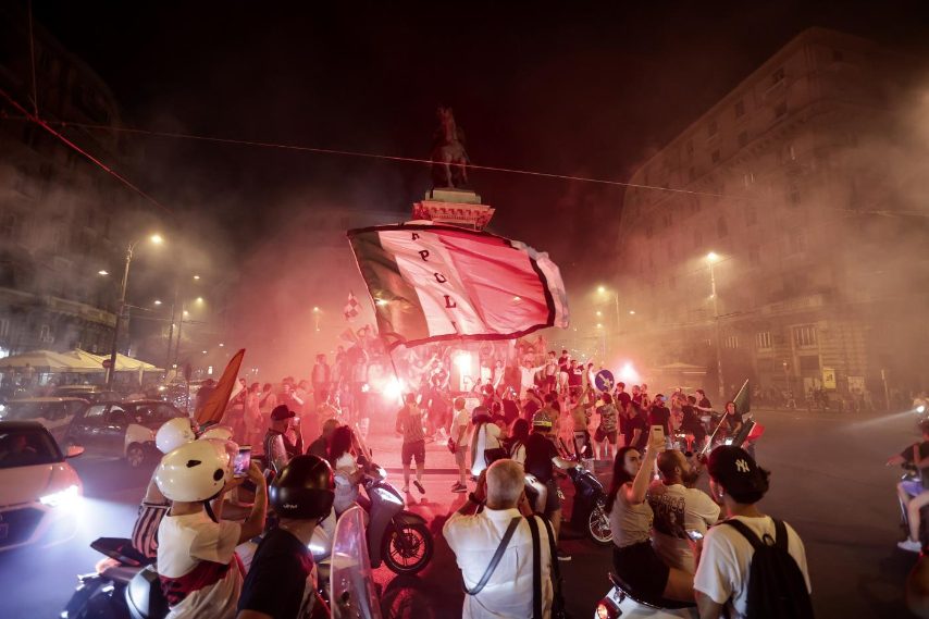 Grande festa a Napoli per la vittoria dell'Italia all'Europeo del 2020. Folla sul Lungomare di via Caracciolo, in piazza del Plebiscito e in tutte le strade del Centro Storico.