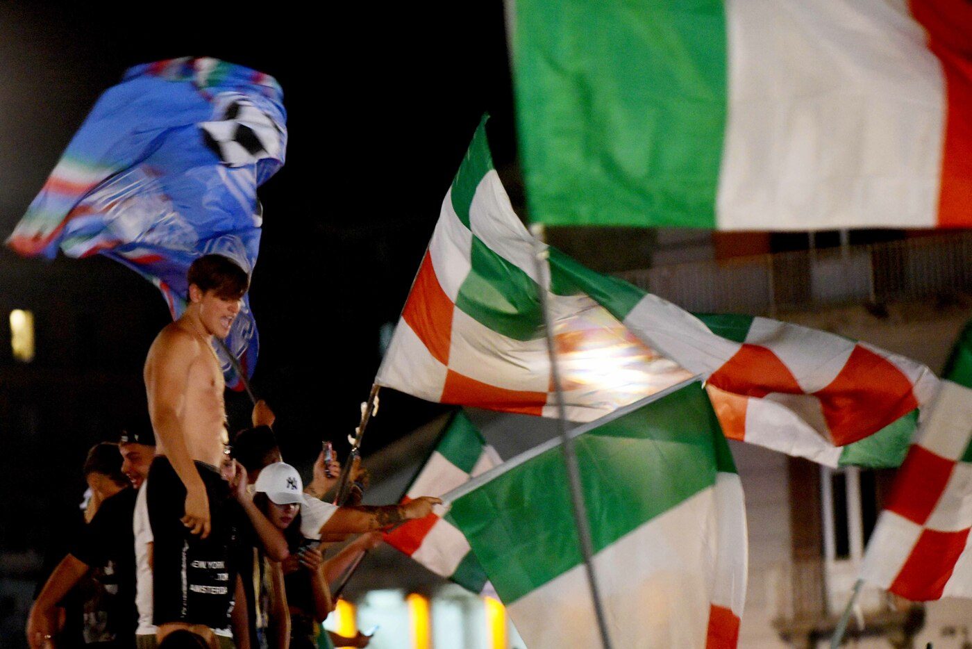 Grande festa a Napoli per la vittoria dell'Italia all'Europeo del 2020. Folla sul Lungomare di via Caracciolo, in piazza del Plebiscito e in tutte le strade del Centro Storico.