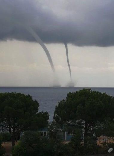Due trombe marine che si avvicinano e quasi si toccano a largo di Siderno, Locri e Marina di Gioiosa Ionica. Solo uno spettacolo naturale per fortuna che non ha provocato danni.
