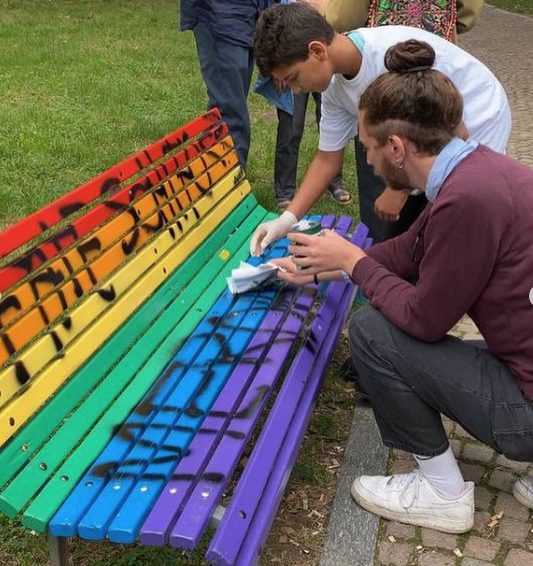 Panchina arcobaleno vandalizzata con insulti verso la comunità LGBTQ+. Le immagini a Piazza Insubria, a Milano, mostrano l'opera di ripulitura di un gruppo di giovani.