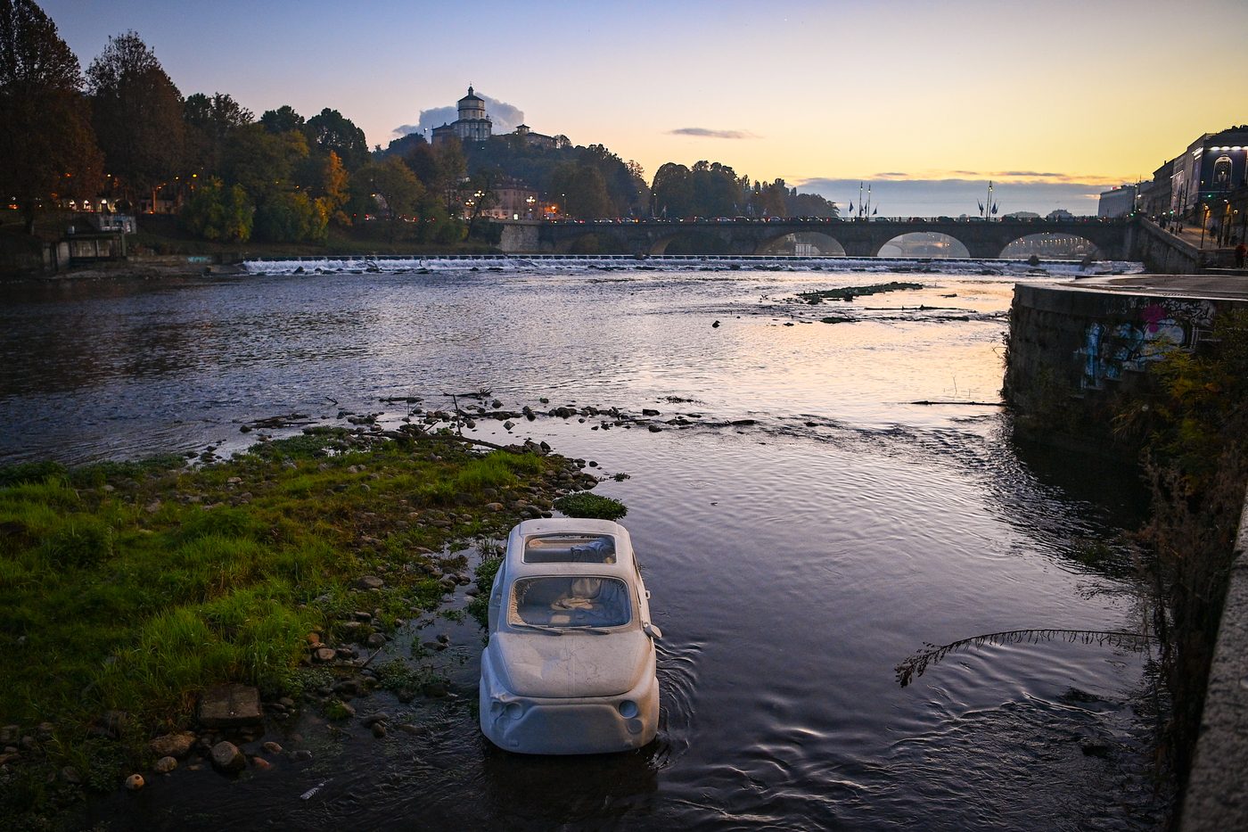 La scultura di marmo dell'artista Nazareno Biondo, raffigurante una Fiat 500 posizionata nel Po a Torino, nella zona dei Murazzi. Abbandonare la cultura dello spreco in favore di quella del riutilizzo: questo il messaggio che lo scultore vuole dare che tocca il tema attuale dell'inquinamento ambientale.