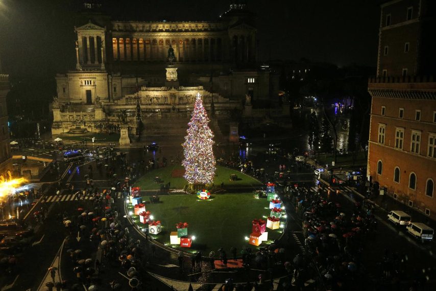 Il centro di Roma si accende con l’inaugurazione dell’albero di Natale a Piazza Venezia e l’accensione delle luminarie di via del Corso.