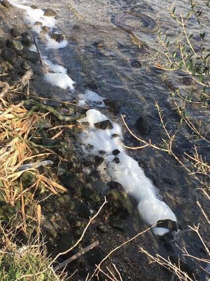 Chiazze di schiuma bianca nel Lago Fusaro a Bacoli