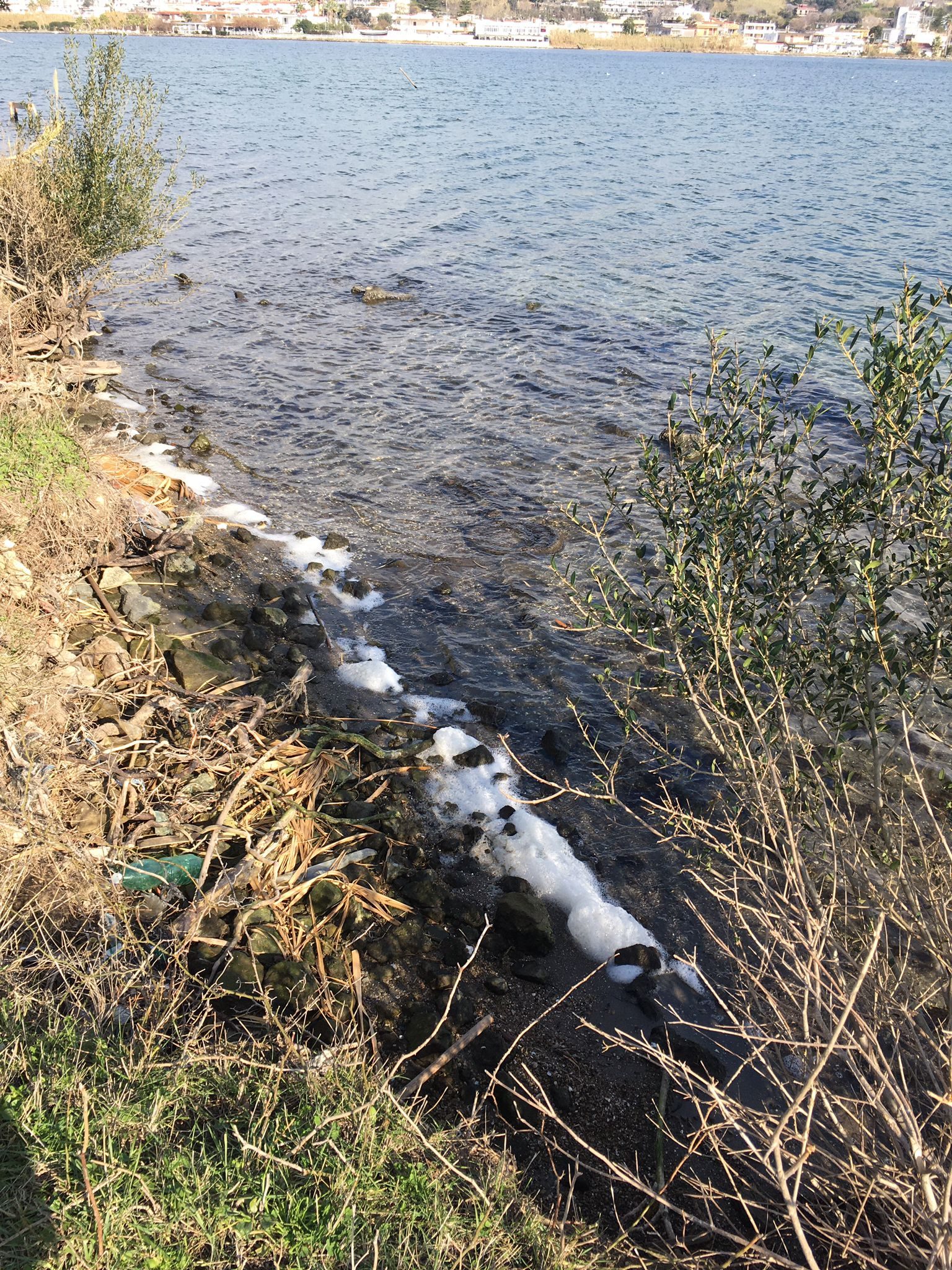 Chiazze di schiuma bianca nel Lago Fusaro a Bacoli