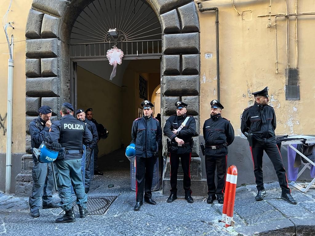 Sgomberato questa mattina dalle forze dell'ordine il palazzo occupato da famiglie legate alla camorra in via Egiziaca a Pizzofalcone, a Napoli.