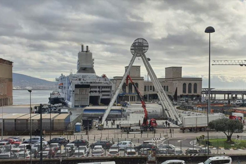 È in costruzione presso la Stazione Marittima di Napoli la ruota panoramica Naples' Wheel di City Eye. Gli operai sono al lavoro già da ieri per il montaggio dell'enorme struttura, alta 55 metri, tra le più grandi d'Europa, che dovrebbe restare fino a fine febbraio 2023.