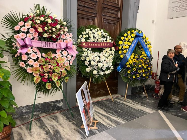 Corone di fiori e poster alla camera ardente di Gina Lollobrigida al Campidoglio