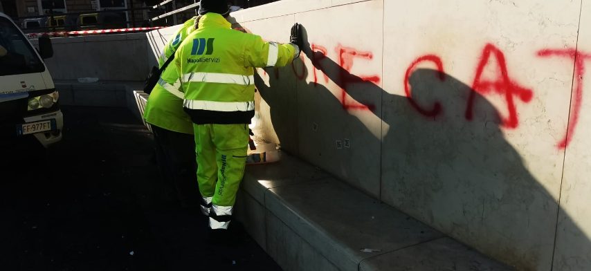 Piazza Municipio a Napoli, restaurata appena l'anno scorso, dopo 20 anni di cantieri, vandalizzata per la seconda volta in meno di un anno. Il Comune costretto ad intervenire nuovamente con gli operai della Napoli Servizi per ripulire graffiti e scritte oscene.
