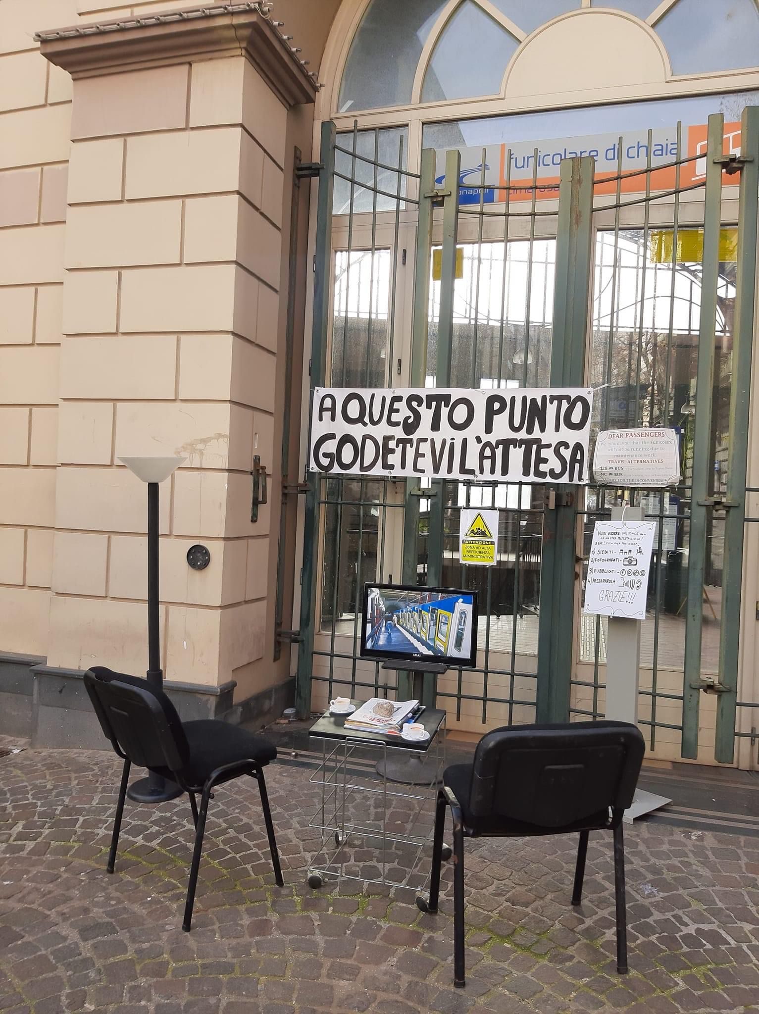 All'esterno della Funicolare di Chiaia, chiusa da ottobre 2022 per lavori che non sono mai partiti, spuntano un tavolino con riviste e cappuccini. Un cartello recita: "Godetevi l'attesa". Il Comune ne ha annunciato la riapertura per Pasqua 2024. Ma si attende ancora il bando. La singolare protesta dei cittadini del Vomero.