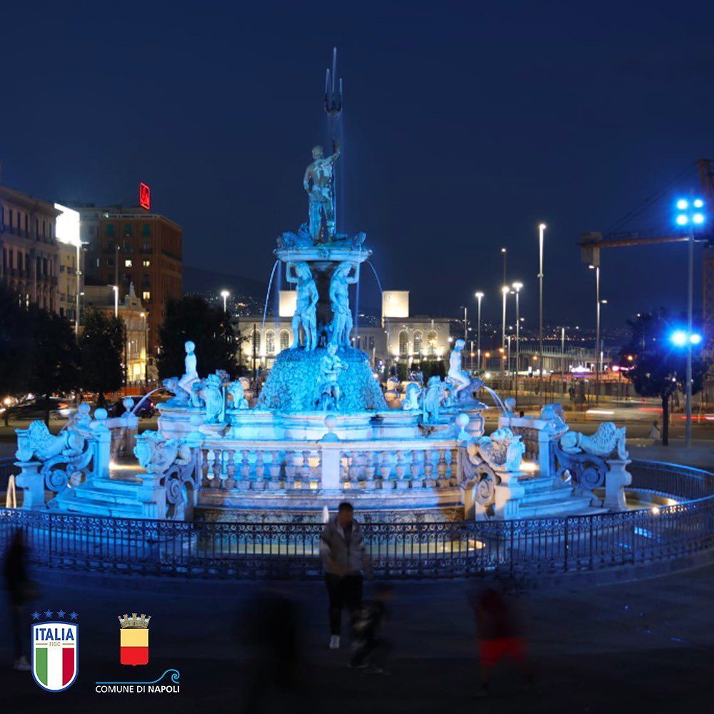Il Maschio Angioino e la Fontana del Nettuno si colorano d'azzurro per accogliere la Nazionale, che dopo dieci anni torna in città in occasione del match contro l'Inghilterra.