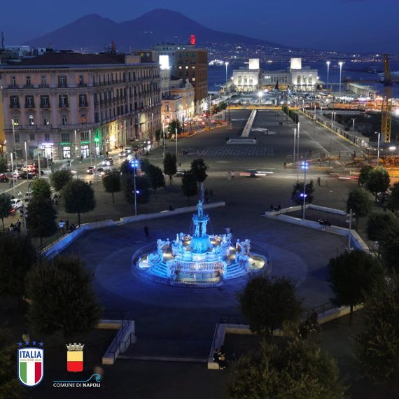 Il Maschio Angioino e la Fontana del Nettuno si colorano d'azzurro per accogliere la Nazionale, che dopo dieci anni torna in città in occasione del match contro l'Inghilterra.