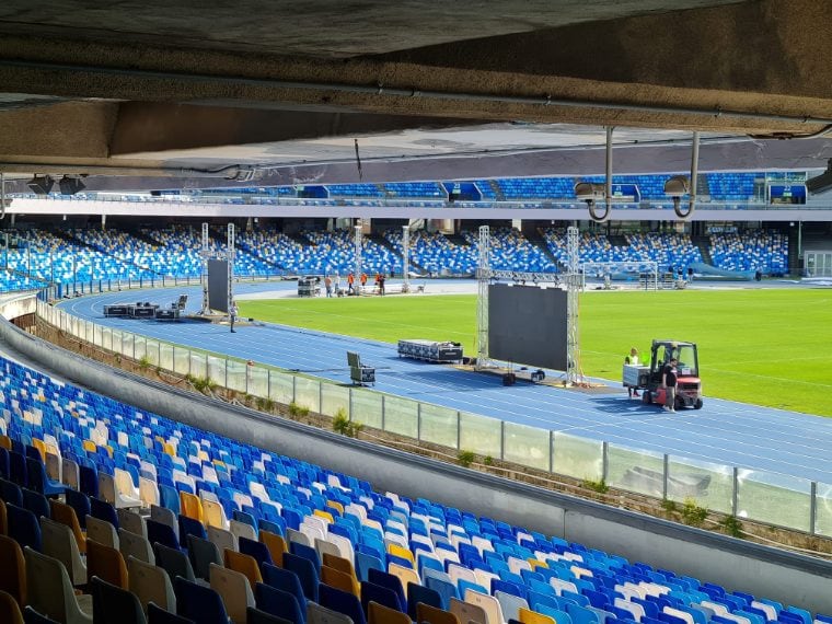 Iniziate le operazioni di montaggio degli 8 maxi-schermi allo Stadio Diego Armando Maradona di Napoli, dove giovedì 5 maggio sarà trasmessa in diretta la partita Udinese-Napoli, che potrebbe assegnare il terzo scudetto alla squadra azzurra dopo 33 anni.