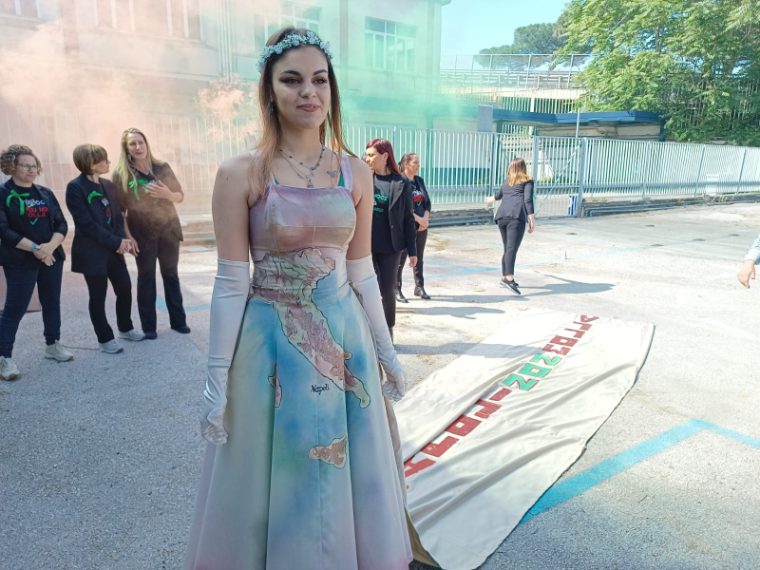 Ex Whirlpool, la sposa operaia sfila con lo strascico per l'anniversario dei 4 anni della vertenza