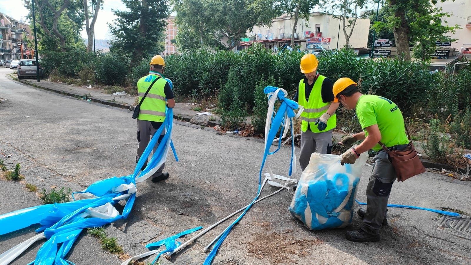 Il Comune prosegue nelle operazioni di rimozione di striscioni e addobbi attaccati in tutta la città per festeggiare lo scudetto del Napoli; gli operai della NapoliServizi interverranno soltanto per quelli legati agli alberi, gli altri dovranno essere staccati dai privati cittadini proprietari di aree private e condomini dove sono stati legati.