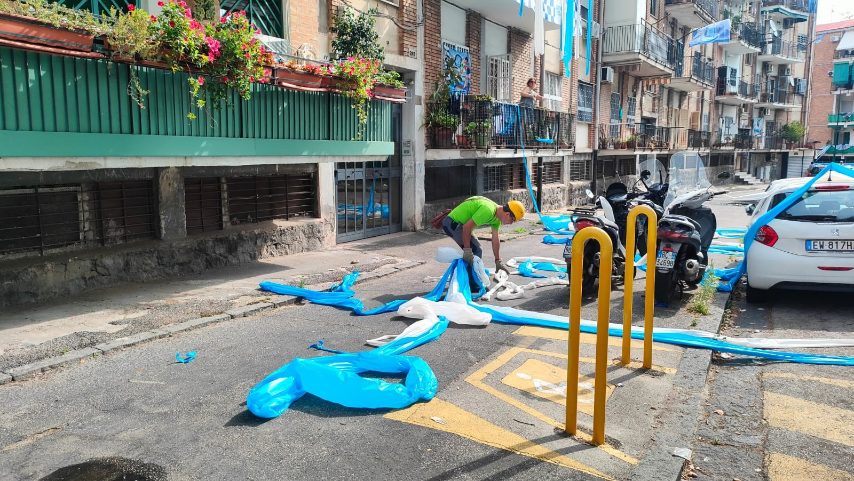 Il Comune prosegue nelle operazioni di rimozione di striscioni e addobbi attaccati in tutta la città per festeggiare lo scudetto del Napoli; gli operai della NapoliServizi interverranno soltanto per quelli legati agli alberi, gli altri dovranno essere staccati dai privati cittadini proprietari di aree private e condomini dove sono stati legati.