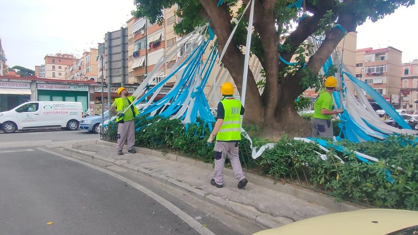 Il Comune prosegue nelle operazioni di rimozione di striscioni e addobbi attaccati in tutta la città per festeggiare lo scudetto del Napoli; gli operai della NapoliServizi interverranno soltanto per quelli legati agli alberi, gli altri dovranno essere staccati dai privati cittadini proprietari di aree private e condomini dove sono stati legati.