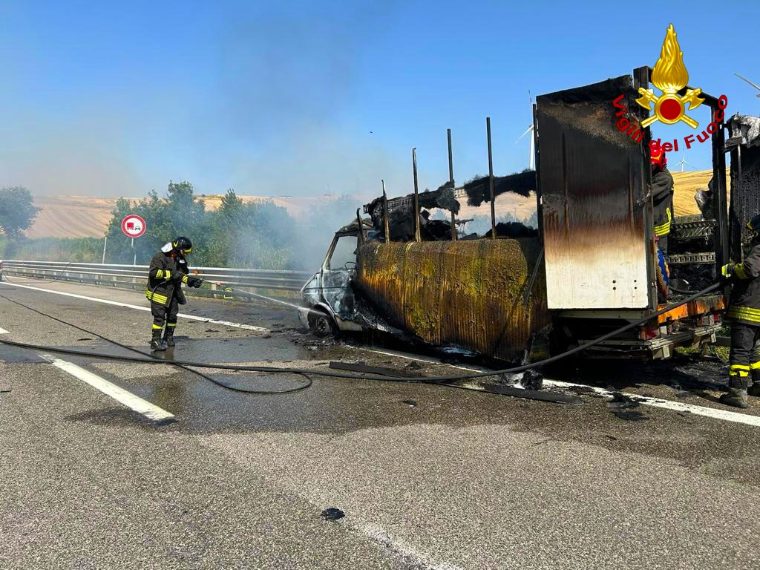 Traffico in tilt sull'autostrada A16, a fuoco un camion che trasportava moto.
