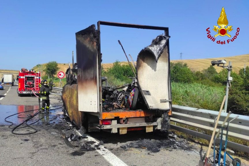 Traffico in tilt sull'autostrada A16, a fuoco un camion che trasportava moto.