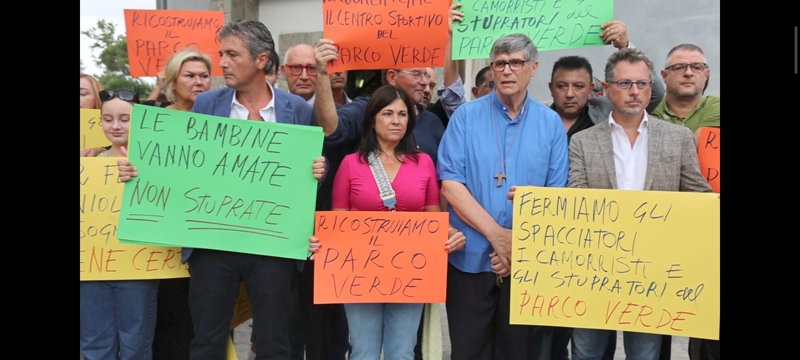 “Ricostruiamo il Parco Verde”, “Fermiamo gli spacciatori, i camorristi e gli stupratori”, “le bambine vanno amate, non stuprate” sono le scritte sui cartelli portati in corteo a Caivano, nel corso della manifestazione a difesa delle due cuginette violentate di 10 e 12 anni. All'iniziativa ha partecipato don Maurizio Patriciello.