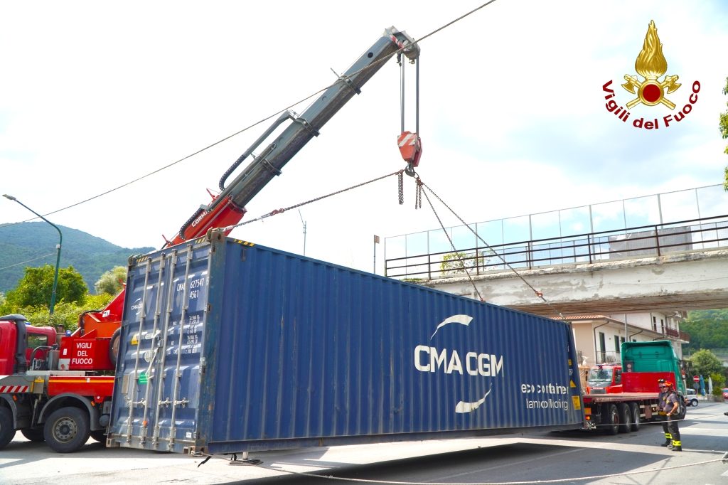 Camion perde il container dopo essersi incastrato sotto un ponte ferroviario a Serino, nell'Avellinese.