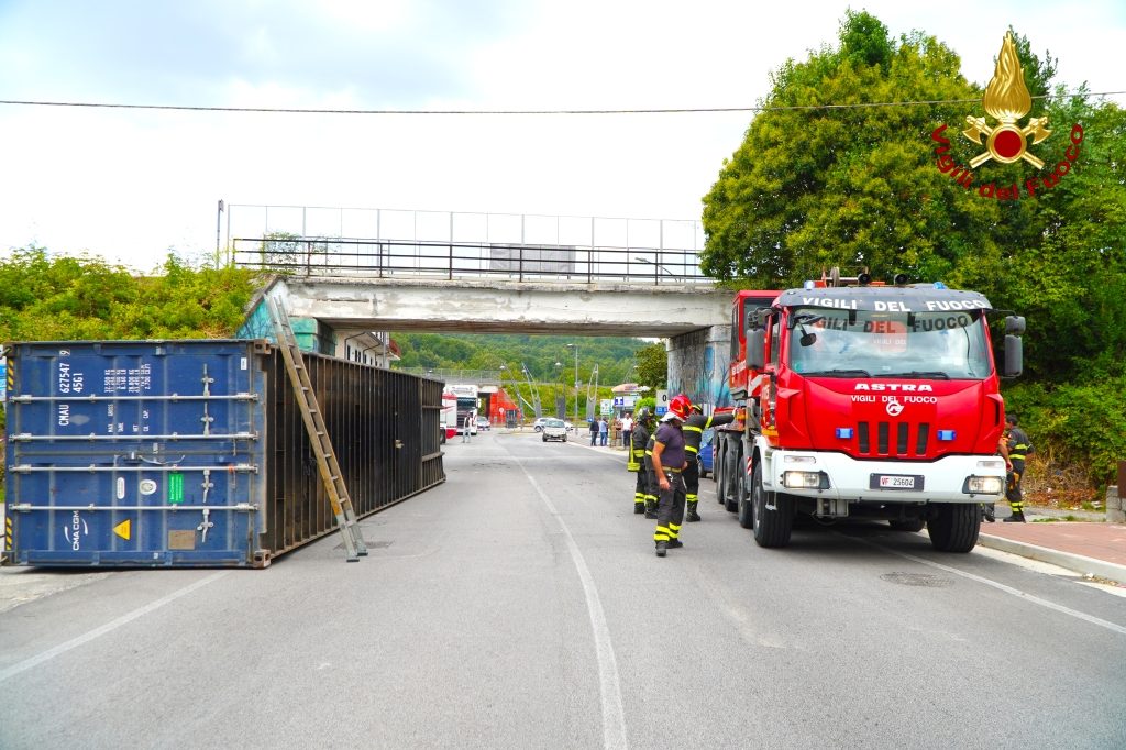 Camion perde il container dopo essersi incastrato sotto un ponte ferroviario a Serino, nell'Avellinese.