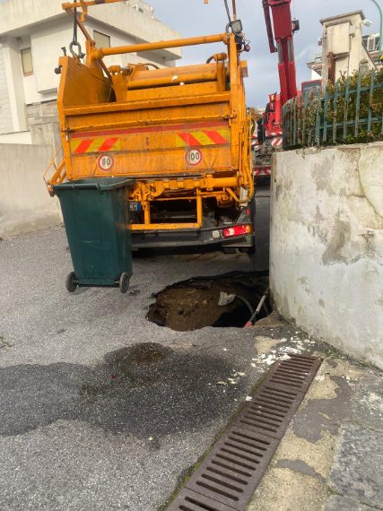 Pozzuoli, voragine in strada inghiotte camion rifiuti