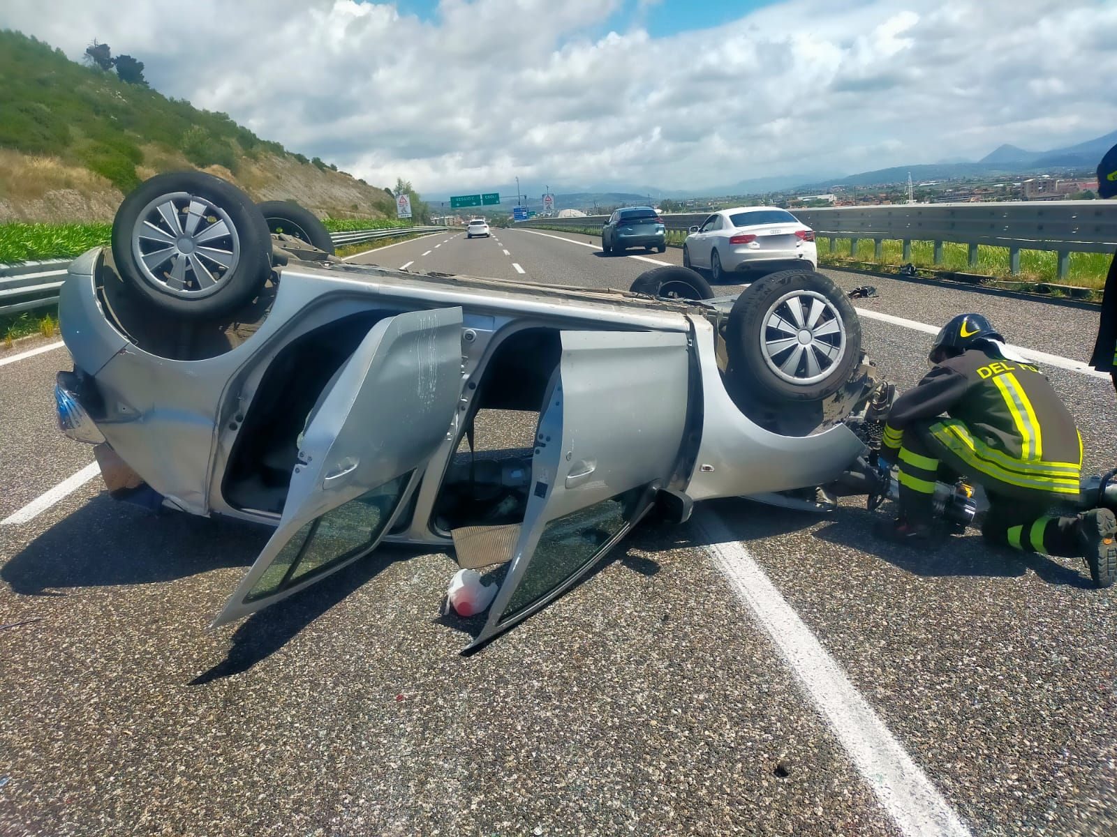 Scontro tra auto sulla A2 Salerno-Reggio Calabria questa mattina, 18 aprile, Venerdì Santo. Nell'impatto, molto violento, un'auto si è rovesciata sulla carreggiata dell'autostrada. Un uomo è rimasto ferito es è stato portato in ospedale. L'incidente stradale è avvenuto all'altezza di Eboli, circa 2 km prima dell'uscita, in provincia di Salerno. Sul posto sono arrivati subito i soccorsi, con l'ambulanza della Croce Verde di Battipaglia del 118, i vigili del fuoco e la polstrada, oltre agli ausiliari del traffico Anas.