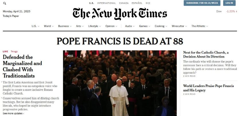 Da Al Jazeera alla Tass, dal Sidney morning Herald a La Nacion, al New York Times: la notizia della morte di Papa Francesco è in apertura di tutti i siti di informazione del mondo