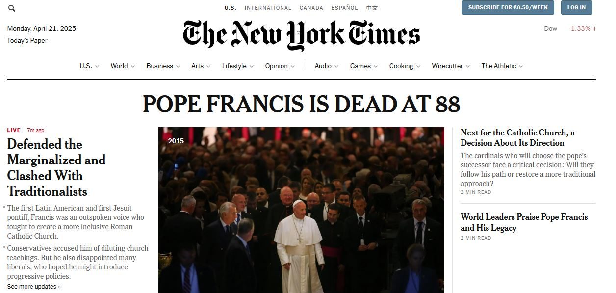 Da Al Jazeera alla Tass, dal Sidney morning Herald a La Nacion, al New York Times: la notizia della morte di Papa Francesco è in apertura di tutti i siti di informazione del mondo