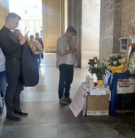 Sotto i portici all’imbocco della piazza di San Pietro, su semplici fogli si può leggere: "Grazie Papa Francesco"; "Ti vogliamo bene"; "Grazie di tutto". Messaggi accompagnati da qualche disegno fatto, si deduce, anche dai più piccoli. Non si sa chi abbia allestito questo piccolo altare ma c'è chi ora sta depositando un po' di tutto: da disegni appunto, a candele e piante di fiori. Anche in questo modo si saluta per l'ultima volta Bergoglio.