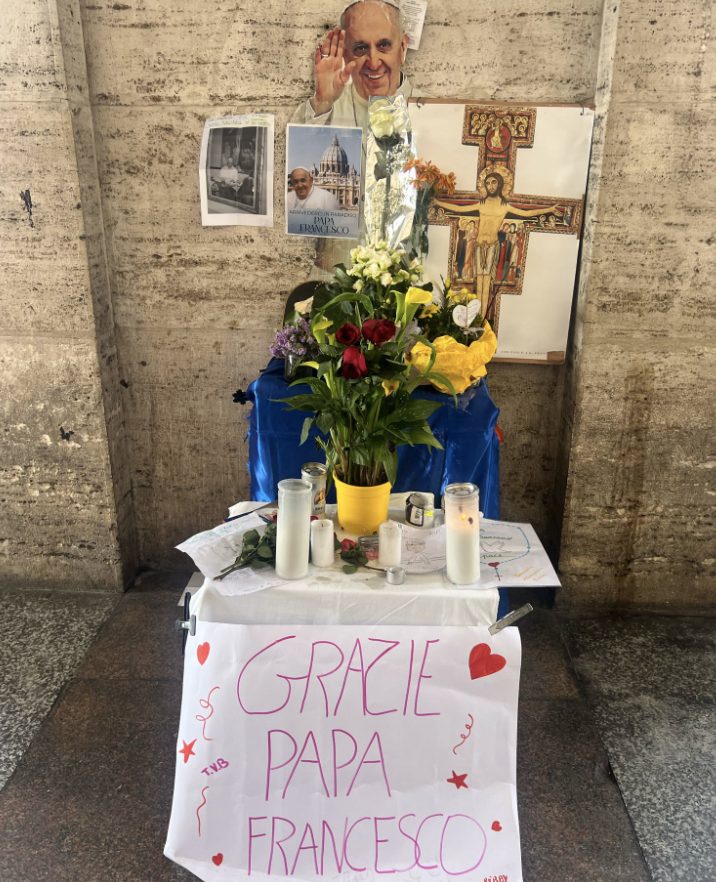 A pochi passi dalla basilica di San Pietro, dove si trova la salma di Papa Francesco, c'è chi ha allestito un piccolo altare per depositare disegni e messaggi per salutare anche così Papa Francesco.