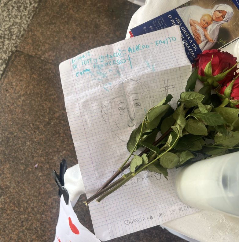 A pochi passi dalla basilica di San Pietro, dove si trova la salma di Papa Francesco, c'è chi ha allestito un piccolo altare per depositare disegni e messaggi per salutare anche così Papa Francesco.