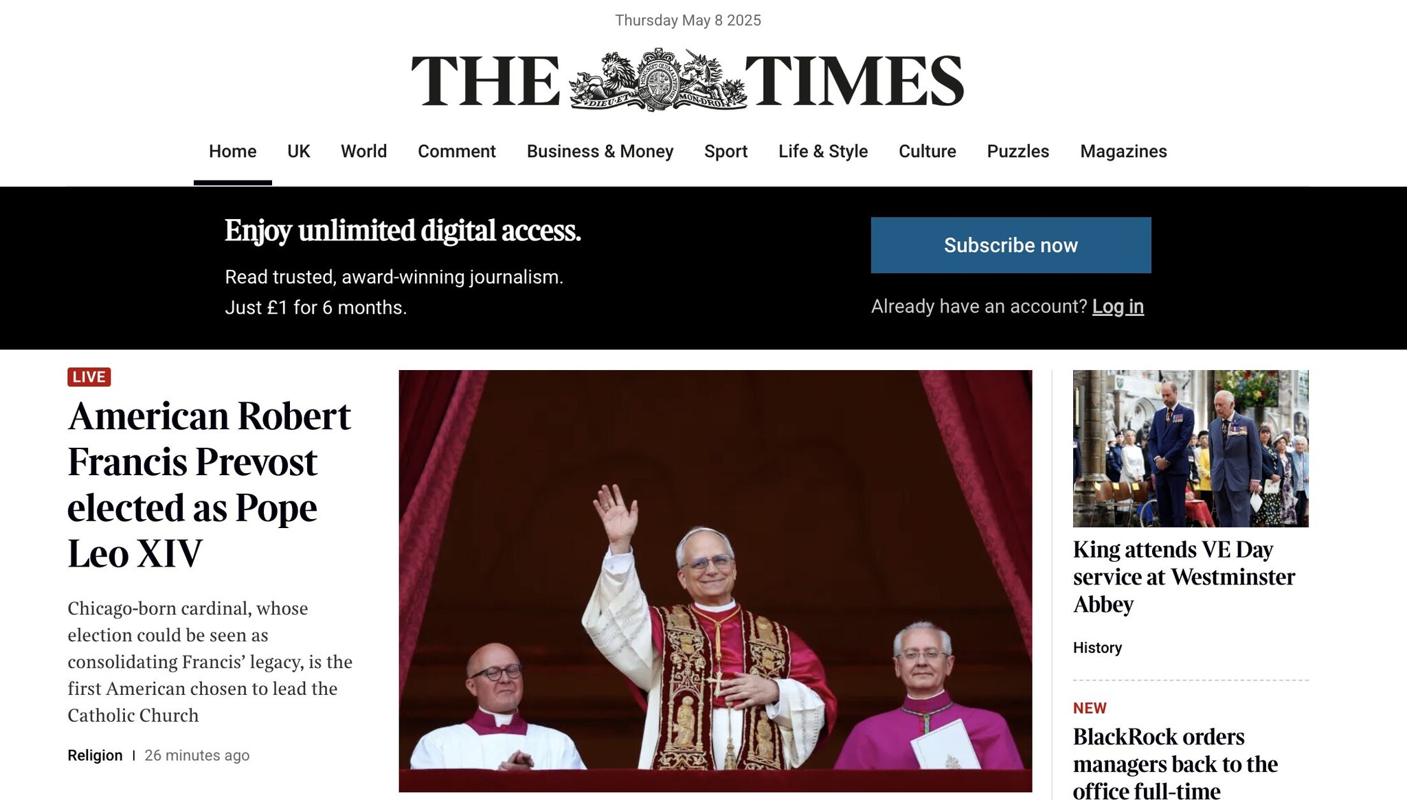 Un attimo dopo che in piazza San Pietro a Roma è stato pronunciato il nome di Robert Francis Prevost, come nuovo Papa, tutte le testate online dei principali giornali internazionali hanno dato la notizia. Ecco le prime pagine e i titoli scelti dai colleghi stranieri.