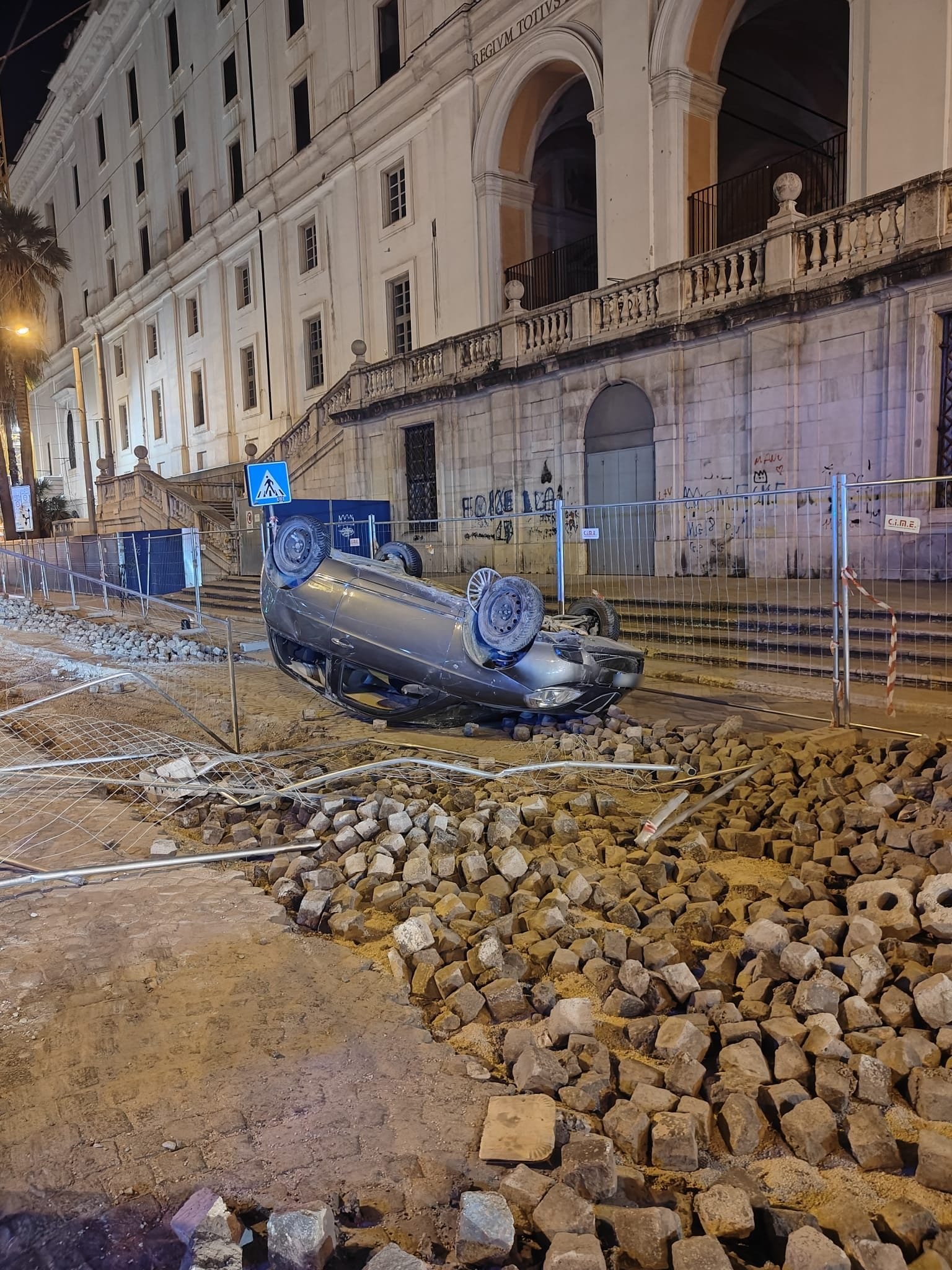 Incidente stradale a piazza Carlo III, a Napoli, dove un'auto, nella serata di domenica 15 giugno, si è schiantata nel cantiere stradale, davanti all'Albergo dei Poveri.