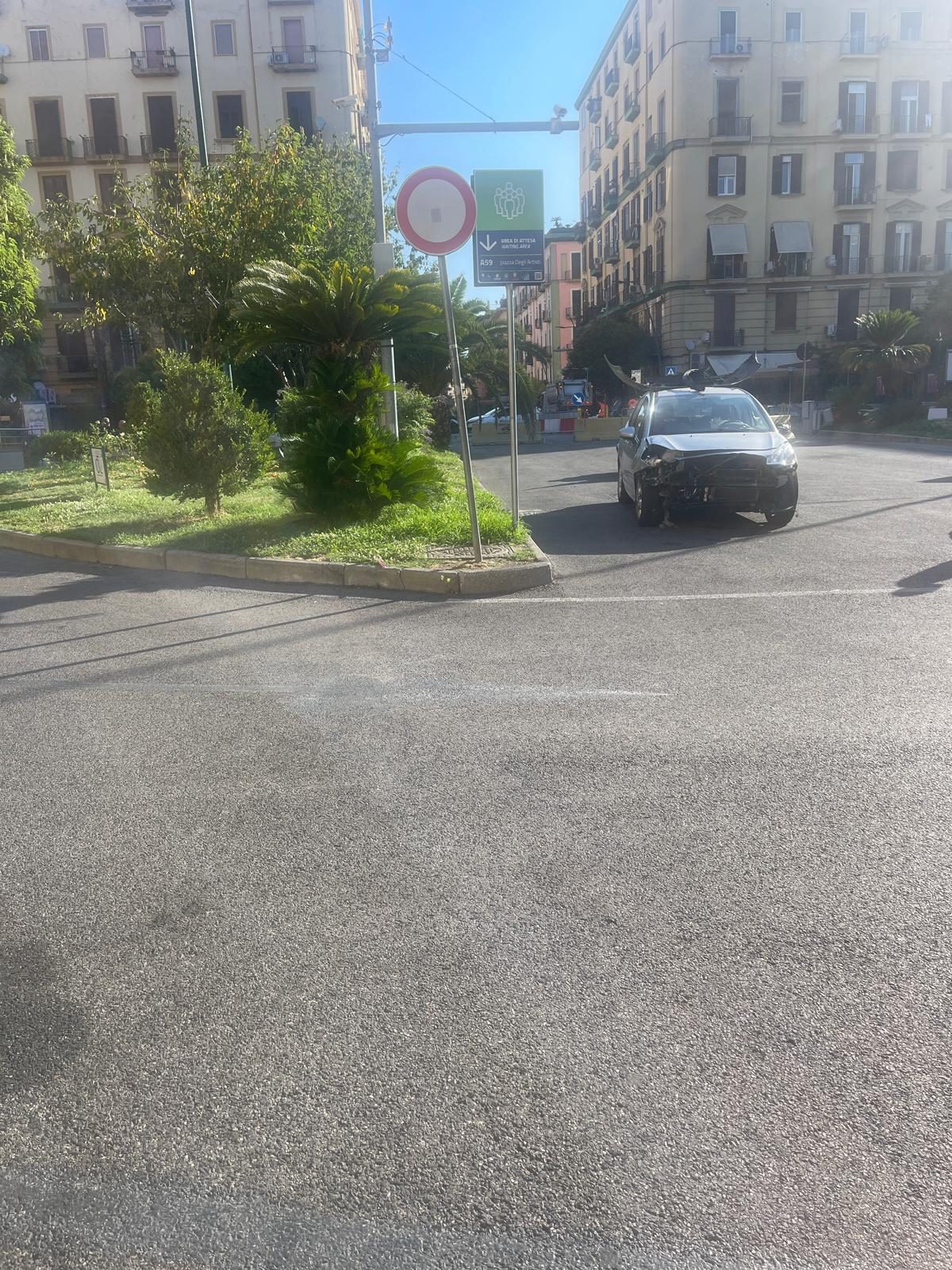 Incidente stradale in piazza degli Artisti al Vomero. Auto si schianta contro i new jersey di cemento. Vettura distrutta.