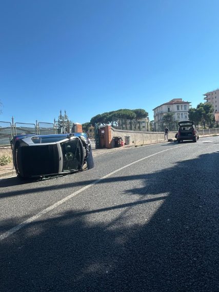 Incidente stradale in via Tasso a Napoli. Scontro tra due auto. Una Smart si ribalta. Ferito il passeggero. Indaga la Polizia Locale.
