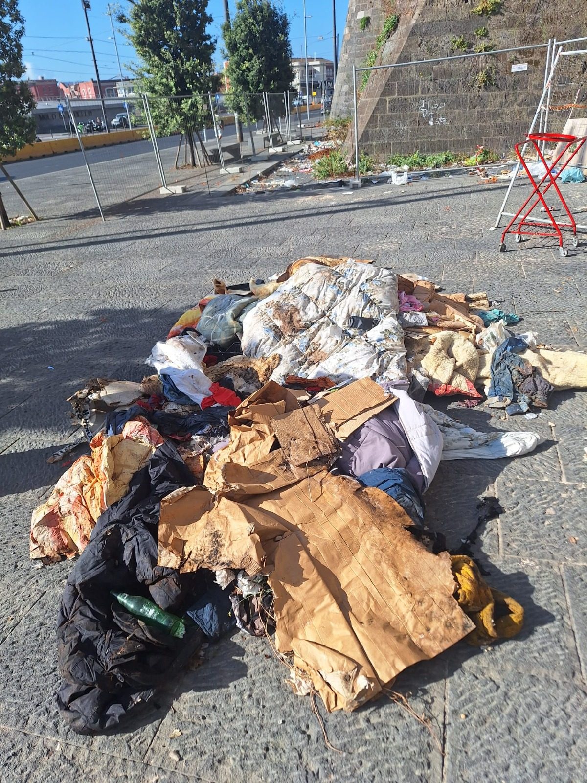 Passeggini, materassi, coperte e perfino materiali di risulta: una discarica a cielo aperto a due passi dal Molo Beverello, sotto le mura del Maschio Angioino.
