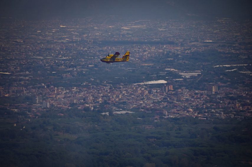 Incendio nel Parco Nazionale del Vesuvio, divampato circa 6 giorni fa. Continuano gli interventi dei Vigili del Fuoco e della Protezione Civile con quattro Canadair e due elicotteri - Boscoreale, provincia di Napoli, 11 agosto 2025. (Foto Alessandro Garofalo/LaPresse)