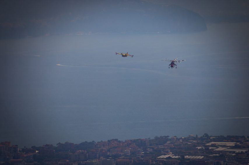 Incendio nel Parco Nazionale del Vesuvio, divampato circa 6 giorni fa. Continuano gli interventi dei Vigili del Fuoco e della Protezione Civile con quattro Canadair e due elicotteri - Boscoreale, provincia di Napoli, 11 agosto 2025. (Foto Alessandro Garofalo/LaPresse)