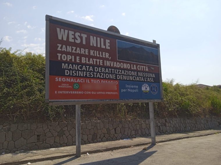 Manifesti giganti, di 6 metri per 3, sono stati affissi in diverse zone di Napoli. Recano la scritta "West Nile, zanzare killer, topi e blatte invadono la città. Mancata derattizzazione, nessuna disinfestazione, denunciata l'Asl. Segnalaci il tuo disagio e interverremo con gli uffici preposti". Sono firmati Insieme per Napoli, Lega Salvini e Napoli Capitale.