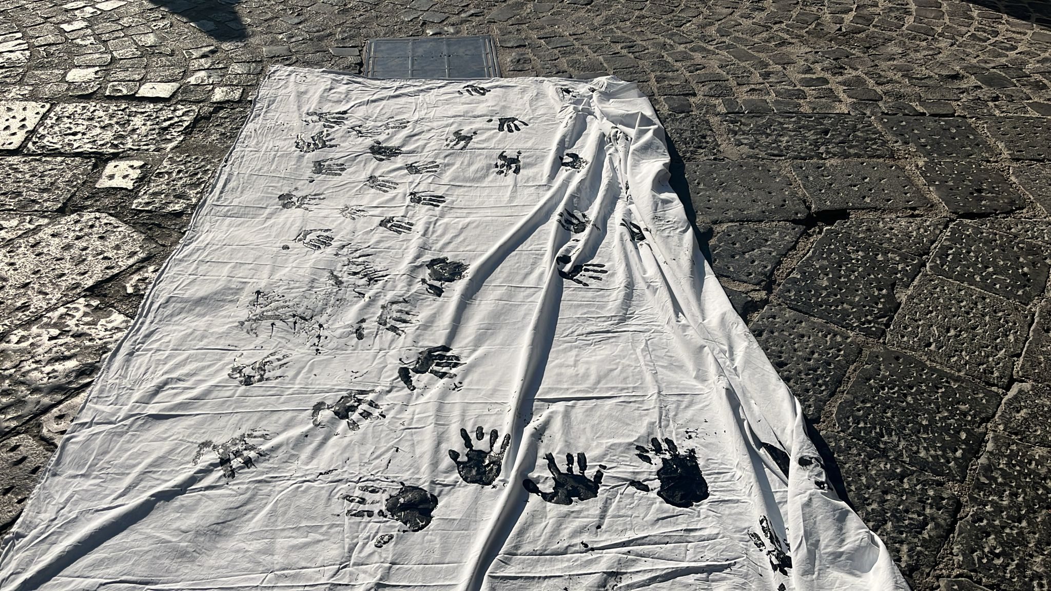 Lenzuola bianche con le impronte delle mani a Porta Capuana per dire basta alla violenza sulle donne, dopo lo stupro della 30enne avvenuto sabato mattina, 11 ottobre.