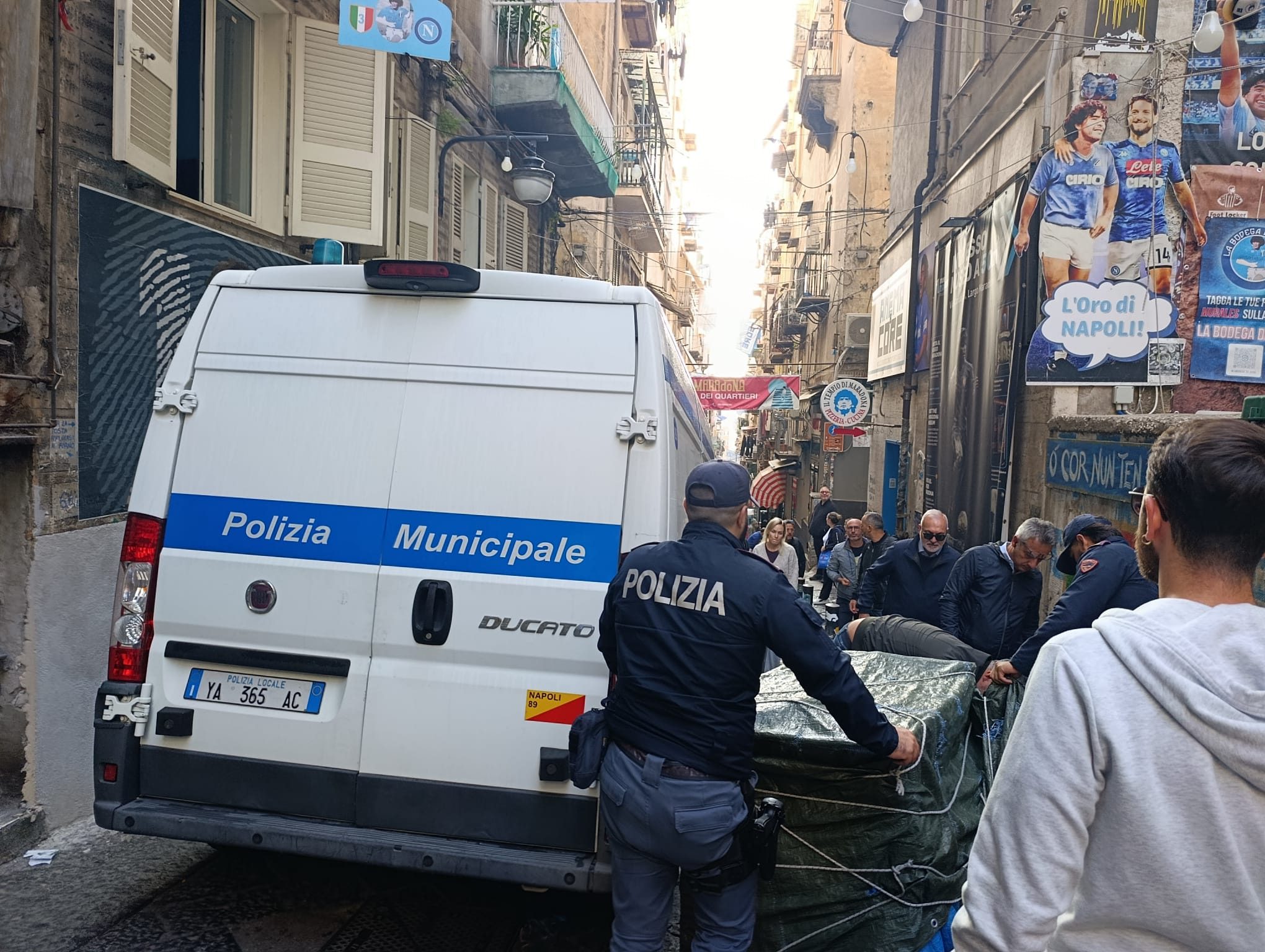A Largo Maradona ai Quartieri Spagnoli i vigili sequestrano e bloccano le bancarelle