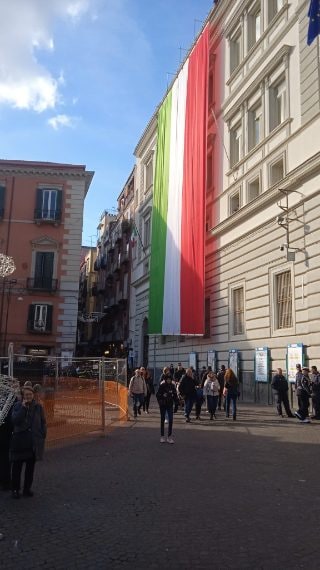 Spettacolare scalata dei vigili del fuoco della facciata del Liceo Classico Genovesi, in piazza del Gesù a Napoli, per la festa di Santa Barbata, patrona del Corpo dei pompieri. La banda musicale in piazza ha suonato l'Inno di Mameli. Un enorme bandiera tricolore è stata stesa sulla facciata della scuola.